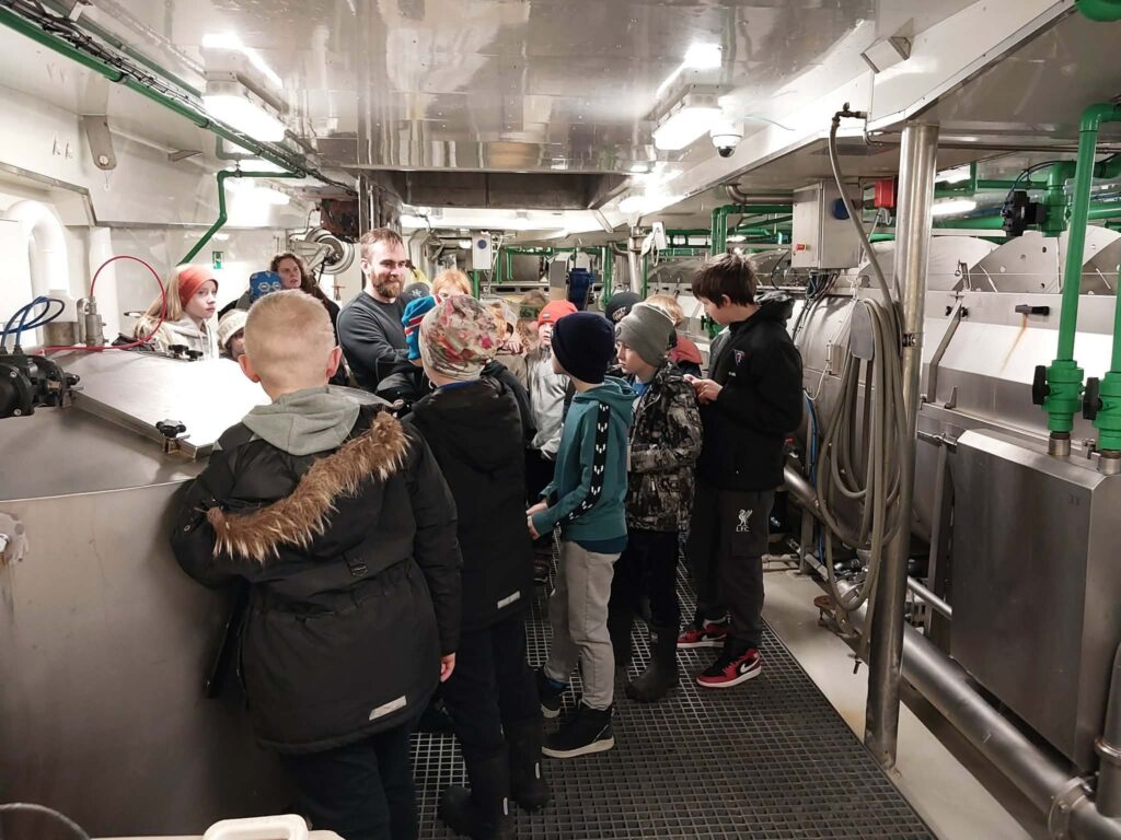 “Við fórum í stýrishúsið [brúna] og fengum að sitja í stjórnstólnum, það voru mjög margir takkar í stýrishúsinu og skipið var rosalega stórt, en lyktin var ekkert sérstaklega góð.” Er haft eftir krökkunum um heimsóknina. En þau fengu að skoða allt skipið og voru spenntust fyrir vélinni, brúnni og tómu körunum í lestinni.